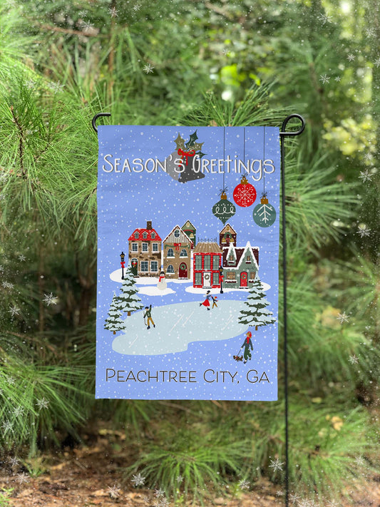 Personalized Garden Flag Featuring Winter Village With City and State, Season's Greetings