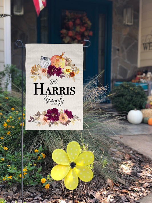 Personalized Fall Garden Flag – Pumpkins & Fall Flowers | Custom Family Name & Est. Year