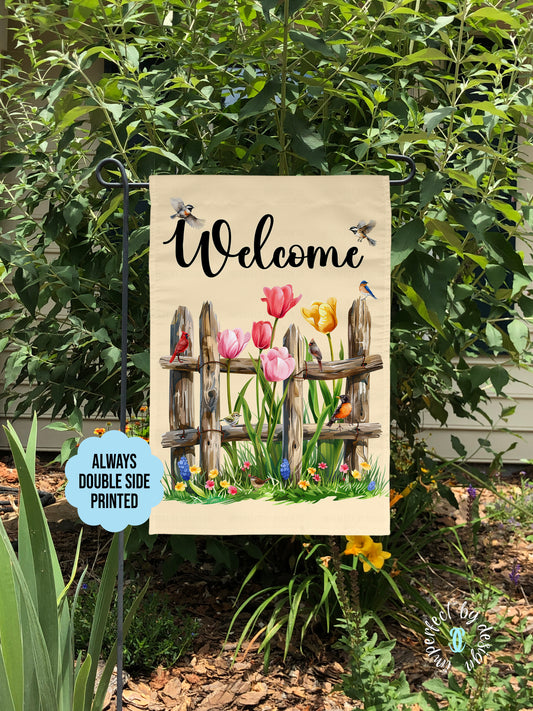 Garden Flag Featuring A Rustic Fence Surrounded By Flowers And Birds, Welcome To Our Garden