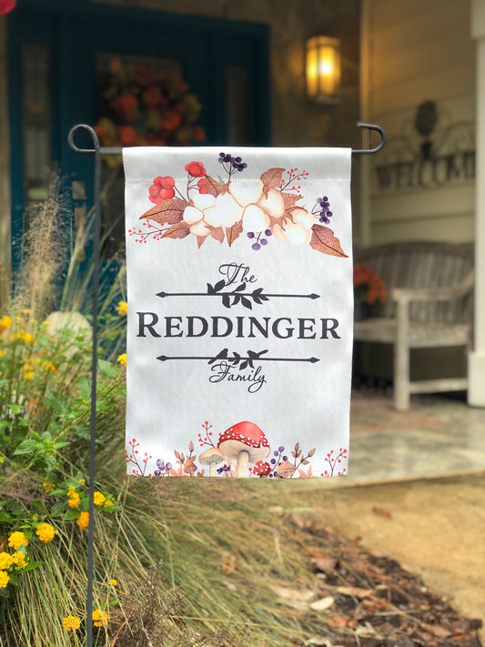 Personalized Fall Garden Flag with Last Name - Autumn Mushrooms & Foliage Design