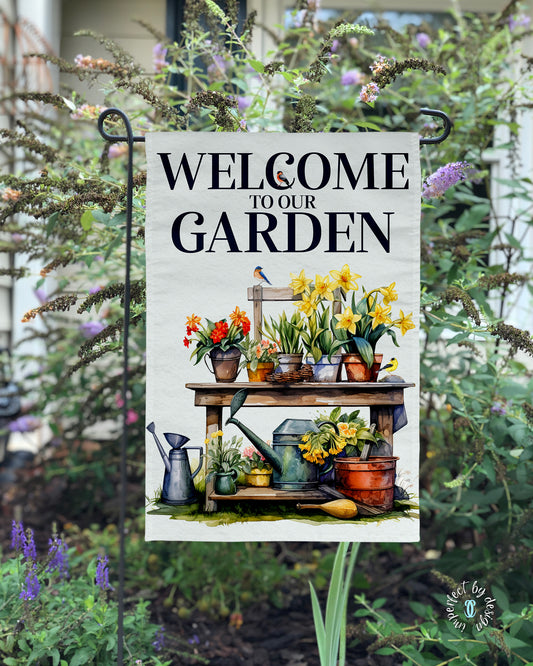Garden Flag With Potting Bench Still Life featuring Flowers and Birds, Welcome To Our Garden