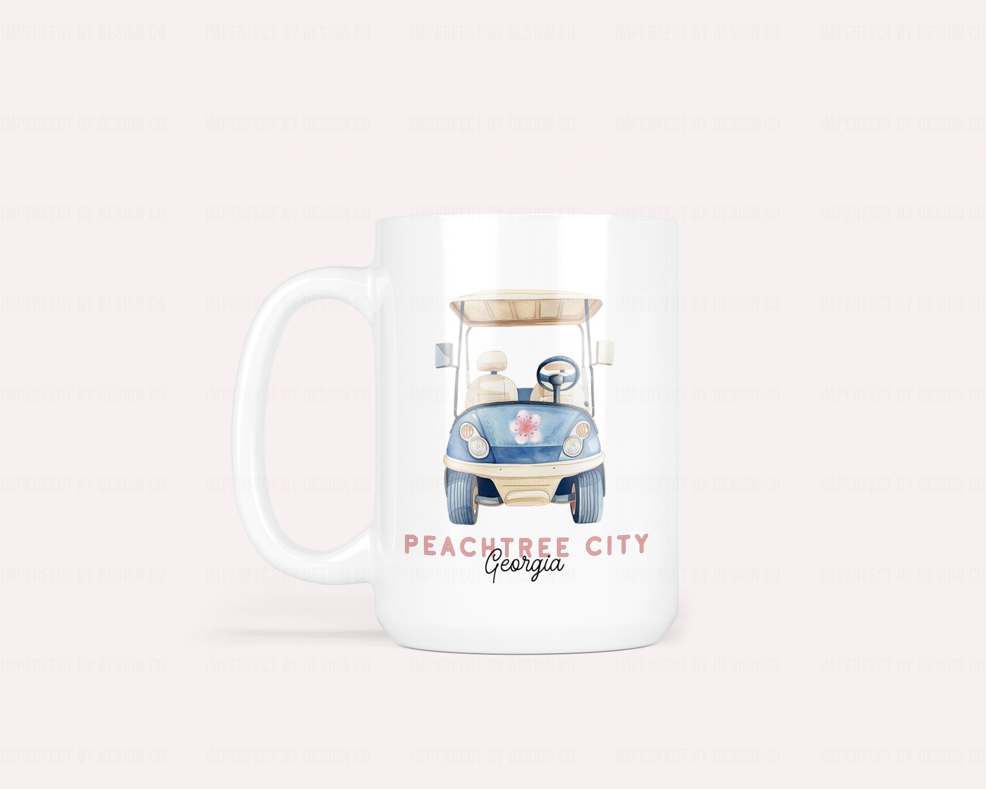 Indulge in your morning brew with a touch of Peachtree City pride using our wonderful ceramic coffee mug. Featuring a charming blue golf cart and "Peachtree City, Georgia", this mug is more than just a vessel for your favorite beverage—it's a celebration of our beloved hometown.