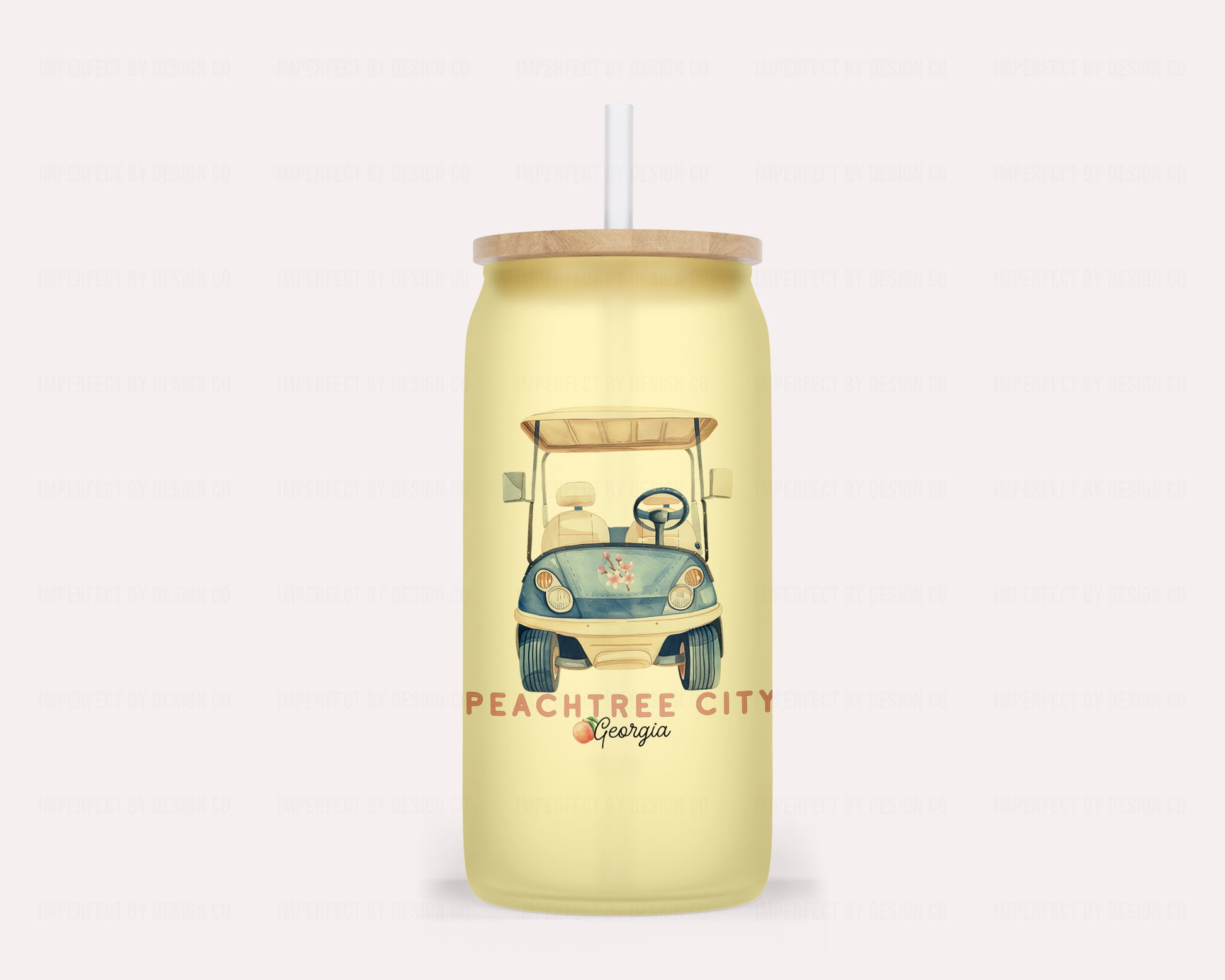 Golf Cart, Peachtree City - 16oz Yellow Color Changing Frosted Glass Jar Tumbler