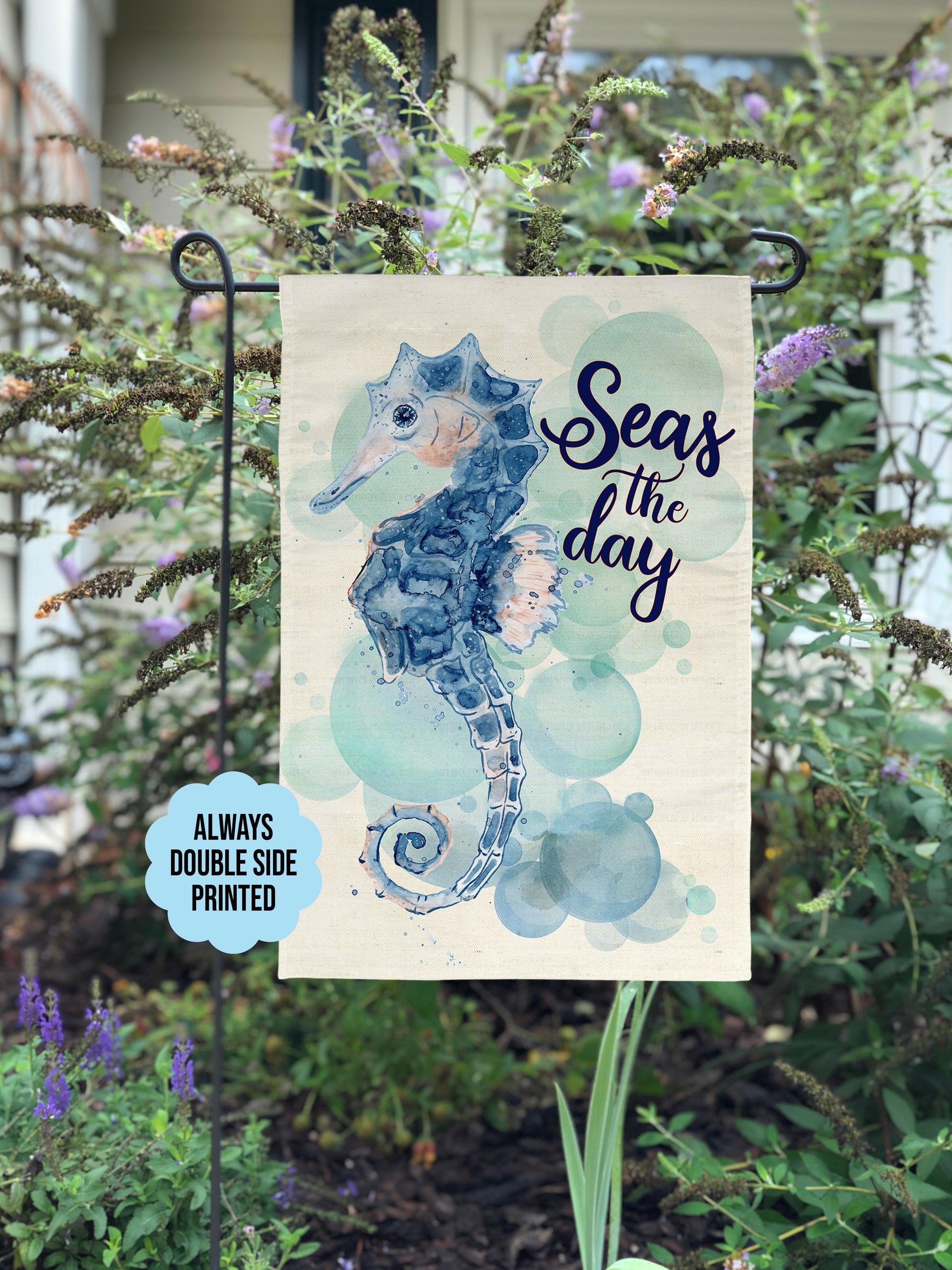 Transform your garden into a coastal oasis with our Coastal Garden Flag featuring a beautiful Watercolor Seahorse and the inspiring phrase "Seas The Day." Bring a touch of the ocean to your outdoor space and remind yourself to seize the day every day.