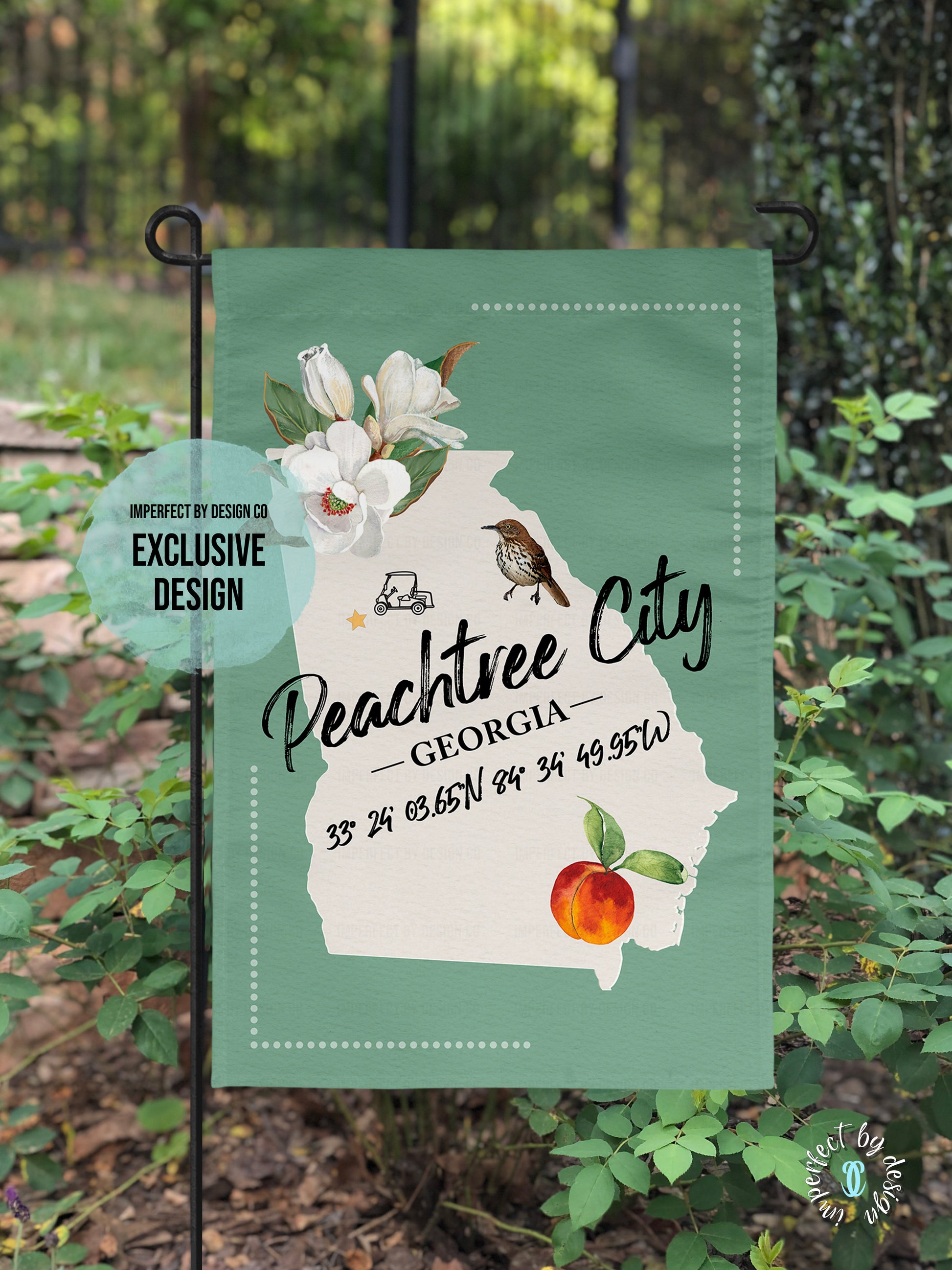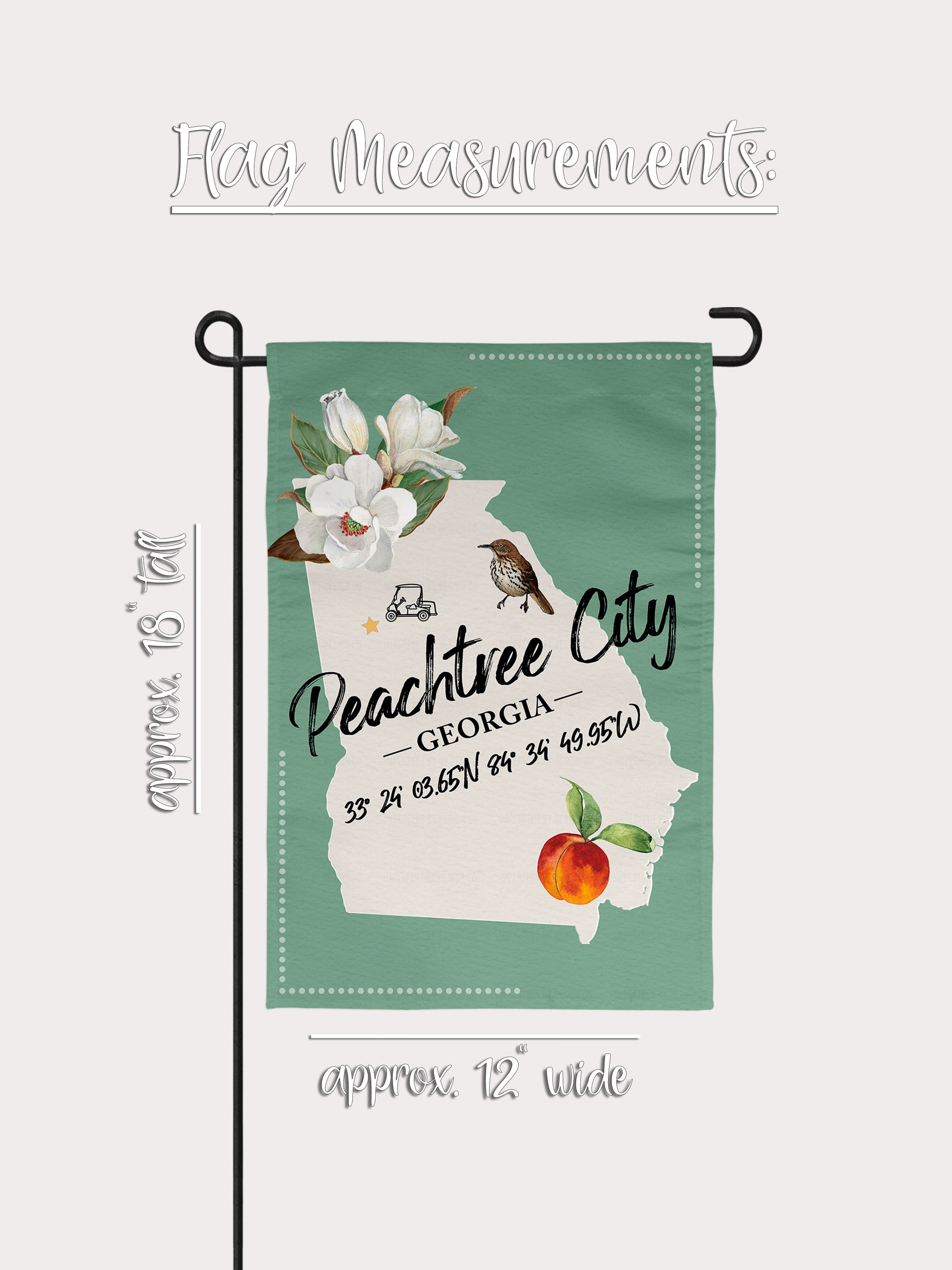 Showcase your love for the Peach State with our beautifully designed garden flag, a perfect addition to any outdoor space. Measuring 12 x 18 inches, this high-quality flag is printed on both sides, ensuring vibrant and eye-catching graphics from any angle.